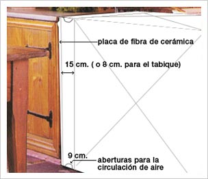 * Si la cocina se quiere colocar entre muebles debe tener presente que es necesario dejar una distancia mínima de separación entre el mueble y la cocina (15 cm aproximadamente), para evitar un calentamiento excesivo, que puede llegar a deformar el mueble. Se recomienda poner una placa de fibra cerámica a los costados de los muebles. Dejar también unas pequeñas aberturas de aire tal y como se ven en el dibujo. Otra opción recomiendada es proteger los muebles con un tabique lateral de ladrillos de 8 cm. aproximadamente, correctamente rascados. En este caso, también se recomienda poner a los costados de los muebles una placa de fibra cerámica